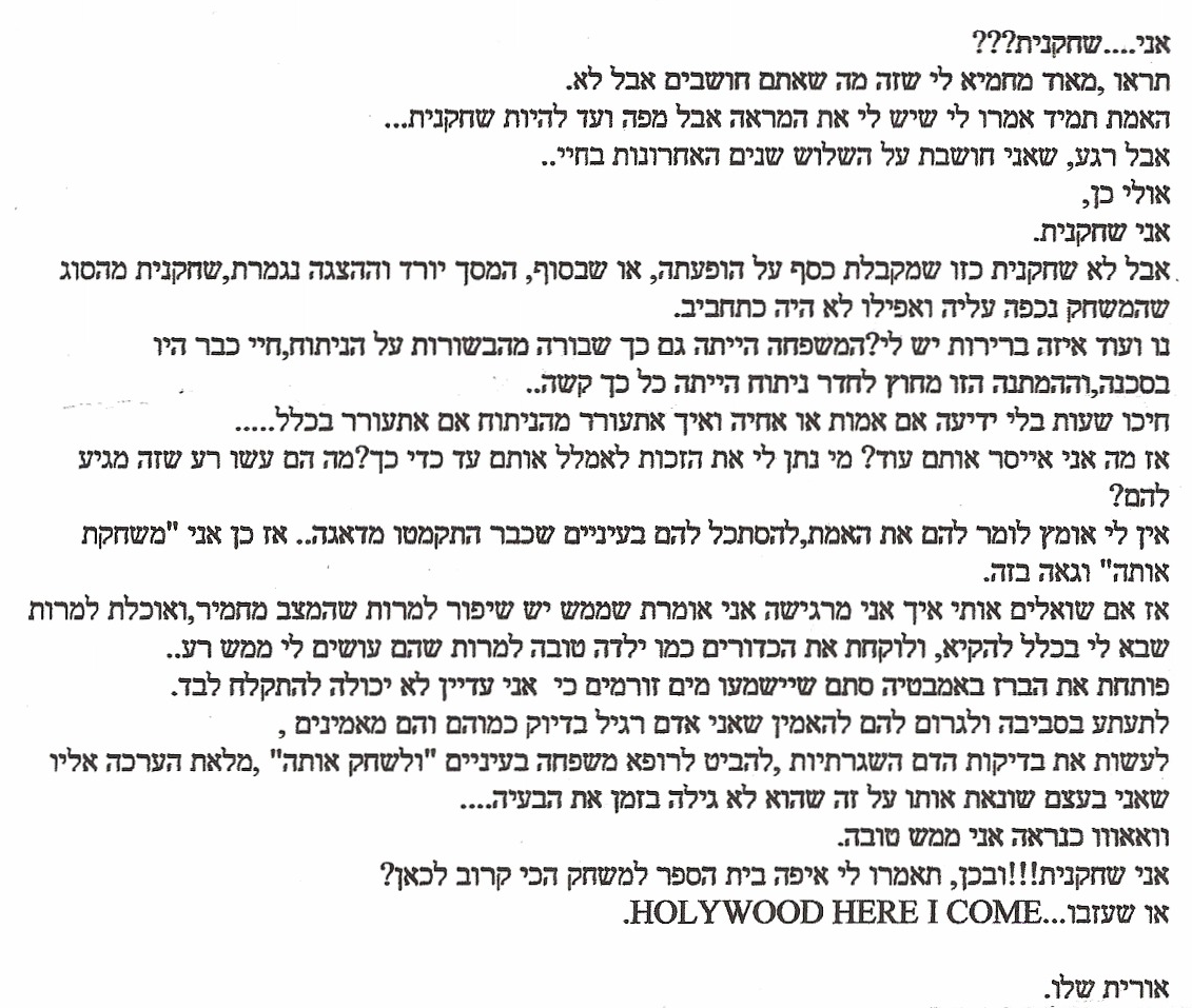 מכתב שאורית כתבה בשנת 2007 אחרי הניתוח השני – השחקנית